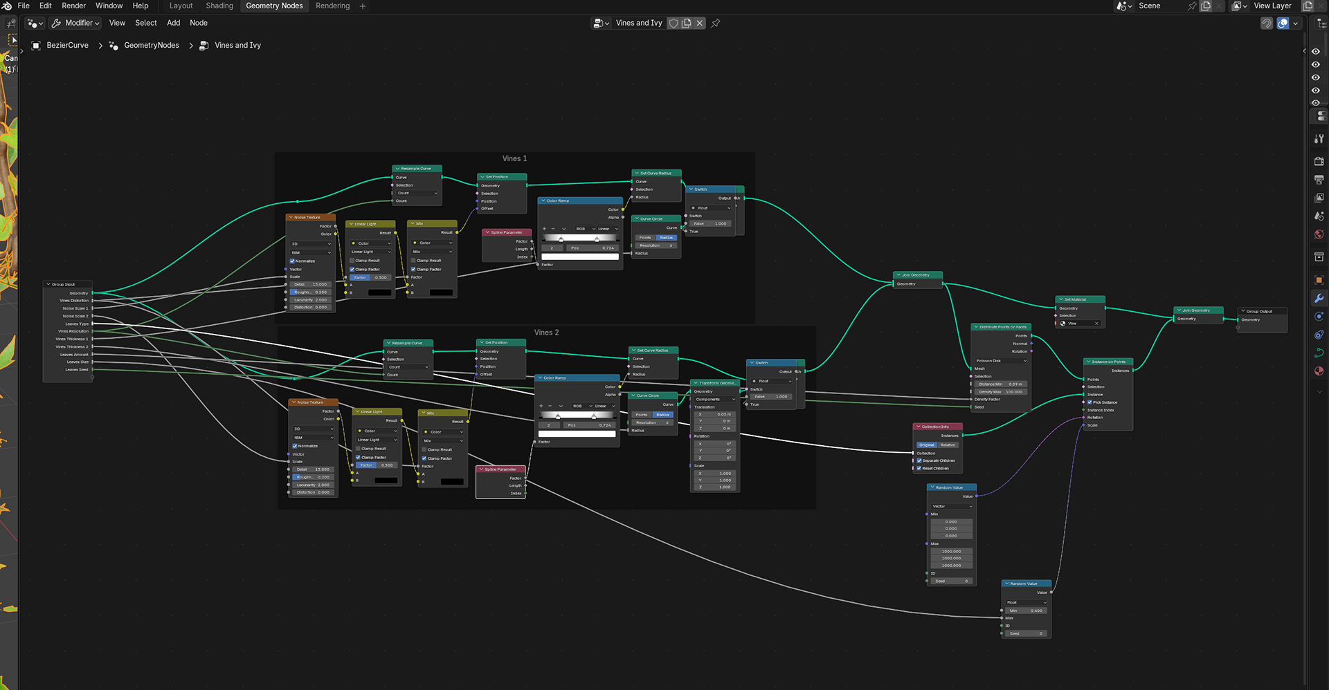 The vines are built from curves using resampling, noise-driven point deformation, and spline-parameter gradients to control taper and thickness, then converted to mesh via a circular profile.