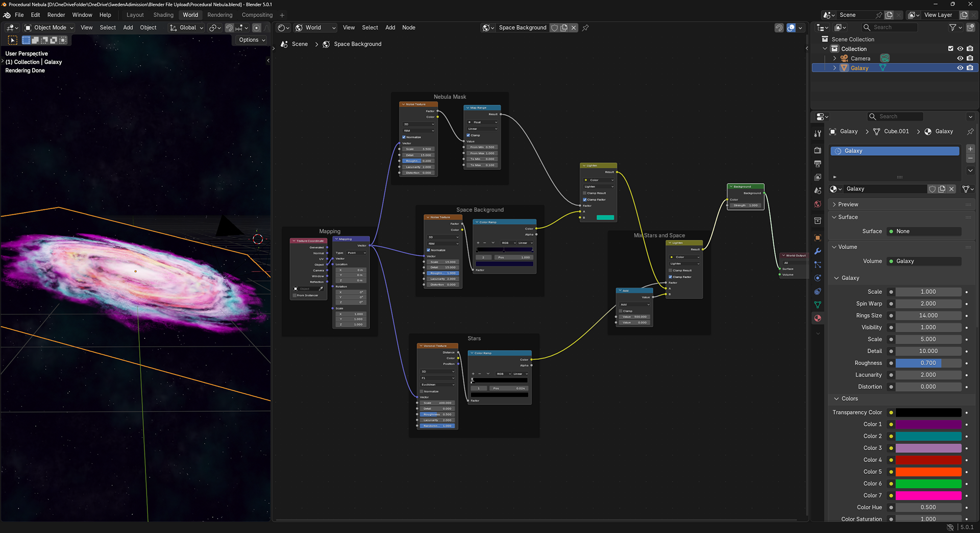 A stylized galaxy/space background generated entirely with procedural nodes in Blender. The World shader layers nebula clouds and star fields using noise- and Voronoi-based patterns, shaped through Map Range/ColorRamp controls and combined with Lighten blending for art-directable density and contrast.