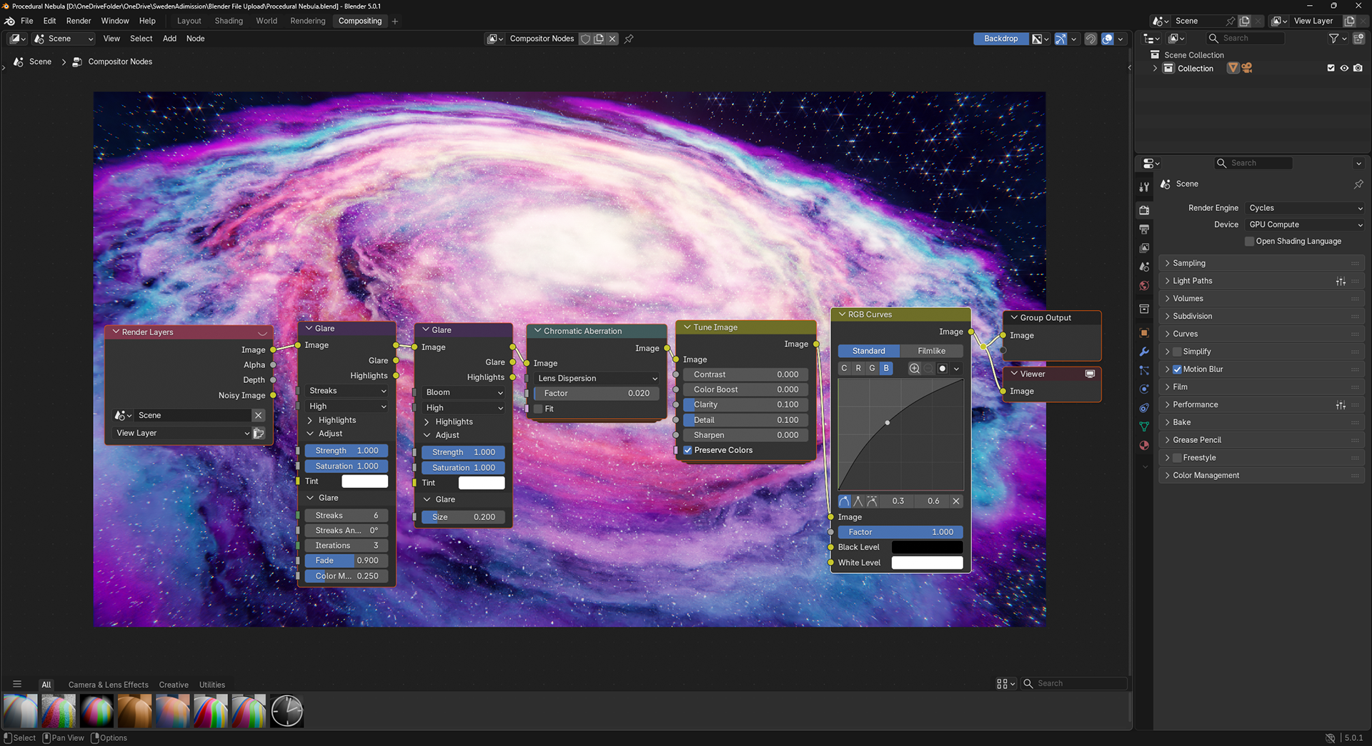 The final look is refined in the Compositor with cinematic post effects, including streak and bloom glare, chromatic aberration (lens dispersion), tonal tuning, and RGB curve shaping. Rendered in Cycles with GPU acceleration and Filmic high-contrast color management.